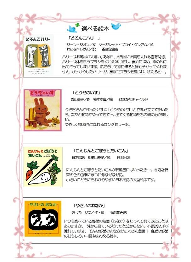 「どろんこハリー」「どうぞのいす」「にんじんとごぼうとだいこん」「やさいのおなか」の4冊の中からお好きな絵本1冊をお選びいただけます。